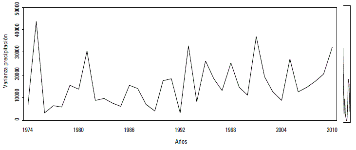 De otro lado, se notan cambios en la cantidad de la precipitación, tanto menores como mayores, toda vez que las pruebas de Mann–Kendall (p–valor = 0,016691) y de Dickey–Fuller (p–valor = 0,06877) confirman respectivamente la presencia de una tendencia positiva en la prueba de la varianza de la precipitación (figura 2 y tabla 1). Esta tendencia fue confirmada al ajustar un modelo Integrated Moving Average —en adelante, IMA— de parámetros (1,1), el cual cumplió con todos los supuestos del modelo. El modelo ajustado es el siguiente: sea Vt la varianza de las precipitaciones en el año t y sea Zt una variable aleatoria distribuida N (0, sigma). Entonces: