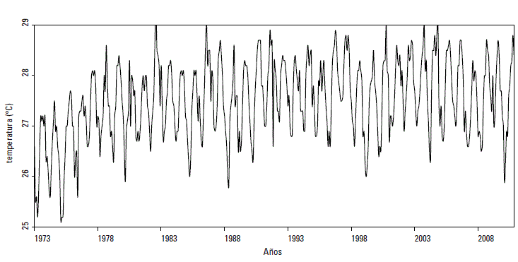 La temperatura y la precipitación se caracterizan a simple vista por ser estacionales (figura 1 y 3). Adicionalmente, la temperatura muestra que está en aumento y con una pendiente pronunciada hasta aproximadamente 1981 (figura 3). Desde 1978 no se vuelven a observar temperaturas medias anuales por debajo de los 27 °C. Al realizar la prueba de Mann–Kendall se obtuvo un p–valor menor a 0,0001 con lo cual se puede rechazar la hipótesis de estacionalidad de la serie (tabla 1). El análisis de series quebradas de temperatura muestra que si se consideran los datos a partir de enero de 1981 en adelante no se detecta tendencia. Esta última vuelve a ser detectada considerando los datos a partir de abril del 2002 y desaparece una vez se consideran los datos a partir de junio del 2003. Finalmente, vuelve a ocurrir tendencia al considerar los datos a partir de agosto del 2010 (es decir, que el último año la temperatura parece aumentar). Esto puede indicar la presencia de periodos súbitos de aumento de las temperaturas seguido de periodos de estacionalidad. No obstante, la prueba de Dickey–Fuller (p–valor < 0,01) sugiere la carencia de tendencia en la serie. De igual forma, las evidencias para la serie de varianzas anuales de temperatura son contradictorias. La prueba de Mann–Kendall (p–valor = 0,47999) no endosa tendencia, mientras que la de Dickey–Fuller (p–valor = 0,08301) sí lo hace. Empero, esta serie pudo ser ajustada a un modelo Autoregressive Integrated —en adelante, ARI— de parámetros (3,1) el cual cumplió con todos los supuestos del modelo, revelando una tendencia creciente en la serie. El modelo ajustado es el siguiente: