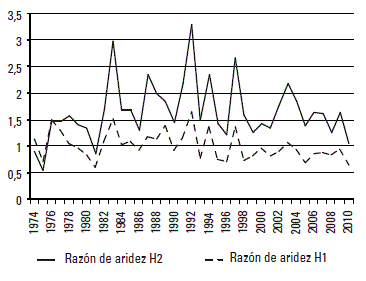 La tendencia observada indica que la sequedad ha ido disminuyendo a través del tiempo. Por su parte, los resultados de la razón de aridez H2 muestran que no hay tendencia según la prueba Mann–Kendall, pero sí es significativa para Dickey–Fuller y lo que es más grave, con tendencia positiva, en franca contradicción a lo anteriormente encontrado.