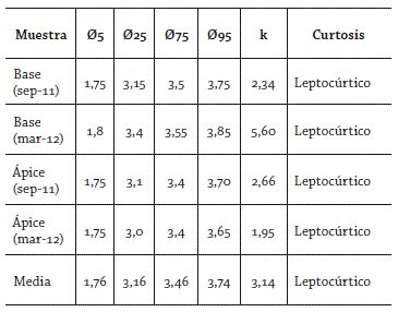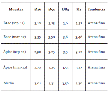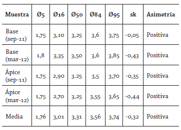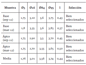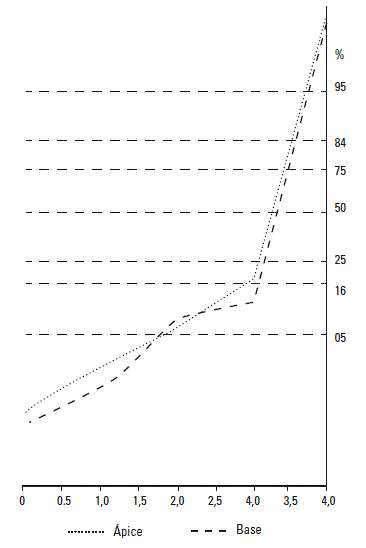 Las curvas granulométricas correspondientes a la zona basal y apical de la duna muestran como principales características ópticas una tendencia a ser alargada hacia el extremo superior y menos inclinada en la zona central (figura 6), lo cual guarda correspondencia con una distribución cuya mayor fracción se ubica hacia el material fino.
