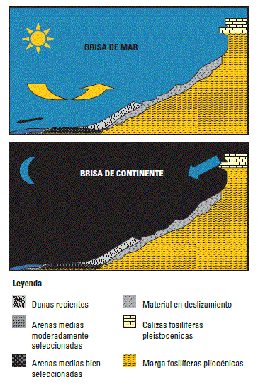 Ahora bien, durante la noche las brisas del continente presentan menor velocidad que las brisas de mar, siendo así, su capacidad de transporte de material es limitada, de manera que solo logra sacar una pequeña fracción del material que se ha depositado durante el día, lo que favorece el cabalgamiento de la duna sobre el acantilado.