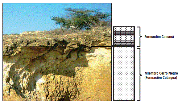 En el caso particular de la zona sur del Castillo de Araya, Bermúdez (1966) identificó la Formación Cumaná (Pleistoceno) que subrayase en contacto discordante (figura 2) con el Miembro Cerro Negro de la Formación Cubagua (Mioceno Tardío a Plioceno Tardío) constituidas litológicamente, de acuerdo con lo reportado por Petróleos de Venezuela S. A. (2011): respectivamente por bancos de moluscos y briozoarios, calizas arrecifales sacaroideas, areniscas cuarzosas grises de grano fino y subredondeados con esfericidad media, areniscas calcáreas, calizas micríticas grises, calcarenitas, caliza bioclástica interestratificada con lutitas gris oliva masivas y laminares con glauconita, arcillas y limolitas grises; y como material accesorio hay cuarzo, lignito y pirita. Mientras que para el Miembro Cerro Negro se reportan: calizas orgánicas de colores claros, calizas oolíticas, lodolitas (mudstones) de color gris claro intercaladas con arcillas de color gris claro a gris azulado, con abundantes fragmentos de equinodermos, pelecípodos y otros moluscos, calcarenitas fosilíferas, areniscas calcáreas, areniscas cuarzosas, grisáceas de grano fino a muy fino, subredondeadas a subangulares, con esfericidad media, muy calcáreas, probablemente periarrecifales; también limolitas color oliva.