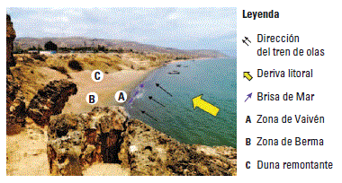 En lo concerniente a las acumulaciones de arena sobre el acantilado, es importante destacar que geomorfológicamente estas corresponden a depósitos eólicos, dado que su orientación fundamental está determinada por la dirección de los vientos dominantes (Strahler y Strahler 1989).