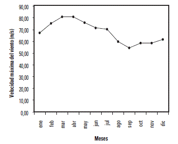 En cuanto a la velocidad, estos vientos alcanzan su máximo valor entre marzo y abril, donde llegan a superar los 80 m/s mientras que el valor mínimo se registra hacia septiembre con 54 m/s (figura 5).