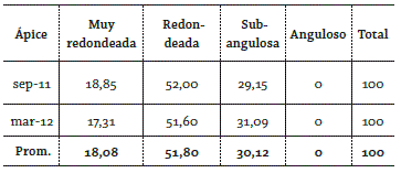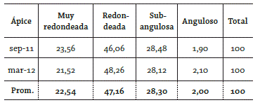 Asimismo, no se registran cambios por posición topográfica a pesar de que en ambos sectores de la duna predomina lo redondeado en la distribución promedio de la forma de los cuarzos, seguido de lo subanguloso, y en tercera posición los granos muy redondeados, como sigue: a) en el ápice 51,80%, 30,12% y 18,08%; y b) en la base 47,16%, 28,3% y 22,54%, respectivamente. En las tablas 6 y 7 se muestran los valores por muestreo y el promedio general por posición topográfica, siendo este último ilustrado en las figuras 8 y 9.