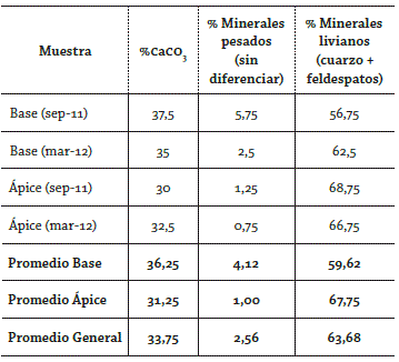 La fracción de minerales pesados es limitada, siendo de aproximadamente un 4% en la zona basal, y apenas un 1% hacia el tope. Esto permite suponer que las partículas de mayor densidad suelen acumularse hacia la parte más baja de la duna (tabla 8).