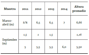 La referida duna, durante el periodo estudiado, ha registrado un remontamiento o cabalgamiento que alcanza un promedio de 6,66 m sobre el acantilado para el periodo de marzo–abril, asociado al periodo de mayor velocidad de los vientos. Para el mes de septiembre, esta suele descender un promedio de 1,16 m hacia la base del acantilado, para ubicarse en una altura promedio de 5,50 m (tabla 9).