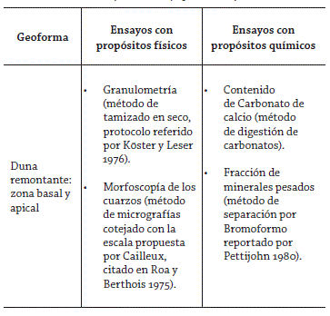 Determinación de parámetros granulométricos: los análisis se sustentan en los datos extraídos de las curvas granulométricas construidas a partir de los valores obtenidos mediante la técnica del tamizado en seco. La hoja de cálculo de Excel fue programada mediante las ecuaciones que permiten precisar los parámetros granulométricos referidos a la tendencia central, selección, asimetría y curtosis.