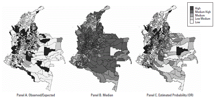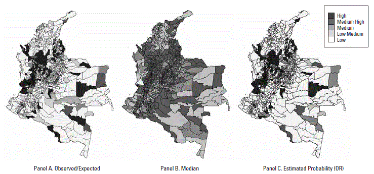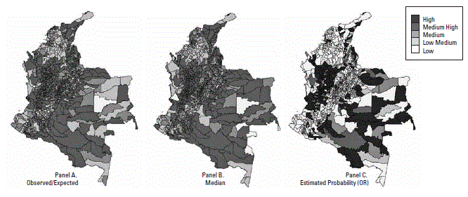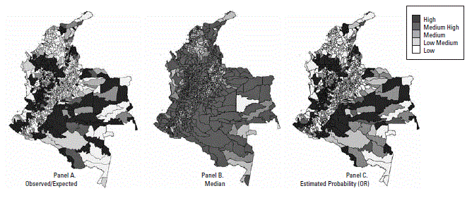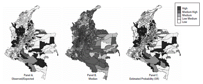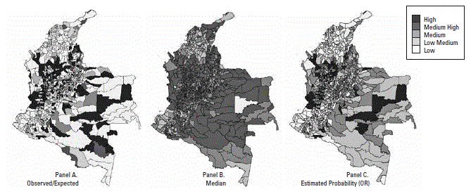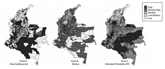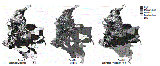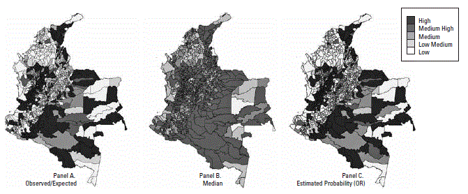 Finally, Panel C (right bottom) shows the spatial trend proposed by the model with the estimated risk of standardized homicide rate assigned to each municipality. One of the advantages of this model is that it graphically represents under–registered observations, by simply contrasting Panel A and Panel C. For instance, the municipalities that passed from zero homicides, uncolored municipalities in Panel A, to completed blacked out in Panel C. The results prove that at least 132 municipalities are detected by the model to be extremely underregistered. Moreover, all other municipalities that do not present extreme results, but still show darkening from observed (Panel A) to predicted (Panel C) values, that is, pass from one category to another, for at least a grade darker, add up to a total of 205 municipalities. Not surprisingly, most of such municipalities are located in isolated areas located in the so–called Macarena region and in the Departments of Llanos Orientales (Arauca, Casanare, Vichada and Meta). Areas aside from the three Andean mountain chains, inhabited by nearly 70% of the total population have the lowest population density in Colombia and therefore have usually been under–counted by census and vital registration systems (Urdinola and Herrera 2015).