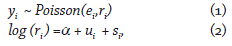 For each year the assumption is that the number of yi cases measured in the i–th municipality, is Poissondistributed with mean (ei, ri) where ei is the expected number of cases obtained from the indirect standardized method of rates and the unknown quantity ri is the risk associated to each i–th municipality, i=1,...,n. The structure of the model is as follows: