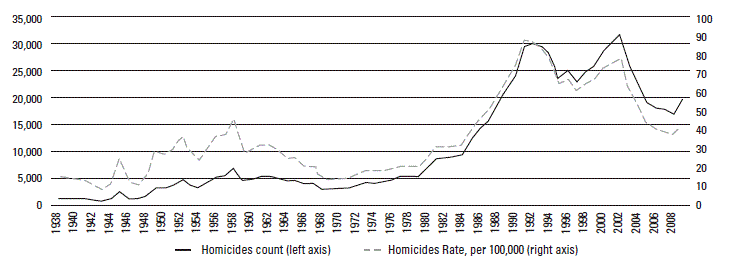 The conflict, then, escalated in magnitude, as well as in number of actors and related victims. By 1991, the overall homicide rate for Colombia reached the levels of 1953, the peak of the La violencia period. After 1990, the conflict intensifies and violence levels simply escalated, which in turn reflected in persistent high homicide rates, as opposed to shorter peak periods observed in the past. This persistence lasts for almost 15 years; therefore, our interest focuses on studying this particular period from 1990 to 2009, as shown in figure 1. The decrease in homicide rates, beginning in 2000, is the result of a very aggressive State policy by an intense military offensive, directed by former President Uribe (2000–2008).