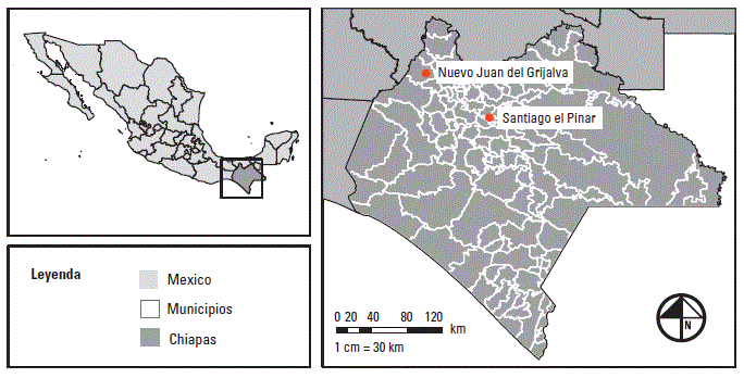 En la figura 1 se muestra la ubicación de las ciudades rurales. La primera, Nuevo Juan de Grijalva, se localiza al norte del estado en el municipio de Ostuacán, que según datos del INEGI en el 2010 contaba con 1.598 habitantes. La segunda se ubica en Santiago El Pinar, en las montañas de Los Altos de Chiapas, en ese mismo año tenía 3.245 pobladores (INEGI 2010a).