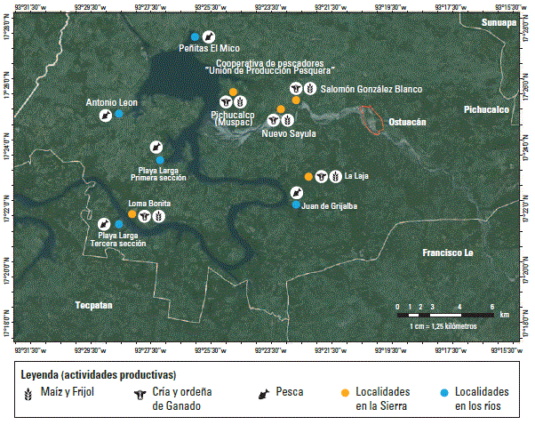 En el 2005, Ostuacán contaba con 97 localidades, su carencia en servicios básicos e infraestructura hicieron que a nivel nacional fuera clasificado en zonas de alta y muy alta marginación (CONAPO 2005), a nivel estatal ocupaba el puesto 52 del IDH (PNUD 2009). Antes de la construcción de la CRS, las principales actividades productivas eran en el sector primario, como se muestra en la figura 2.