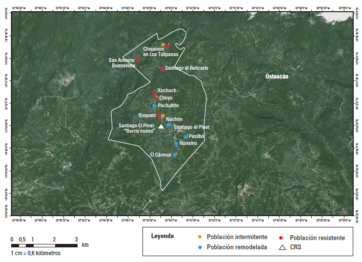 Antes de la CRS, la población de Santiago se distribuía alrededor de la cabecera municipal, las localidades más cercanas eran Choyo, Nínamo, Pechultón, Boquem, Pusilhó y Nachón que concentraban el 79,5% de la población; el resto de la gente vivía en poblaciones más lejanas, tales como Xchuch, Kálom, Santiago el Relicario, San Antonio Buenavista y Chiquinch’en Los Tulipanes.