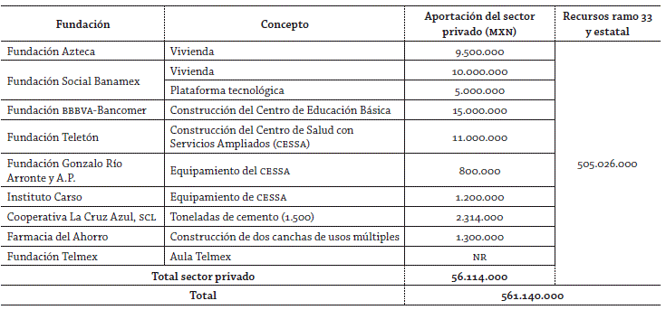 Las empresas privadas otorgaron recursos económicos para la ejecución de la primera CRS Nuevo Juan de Grijalva, como se observa en la tabla 1.