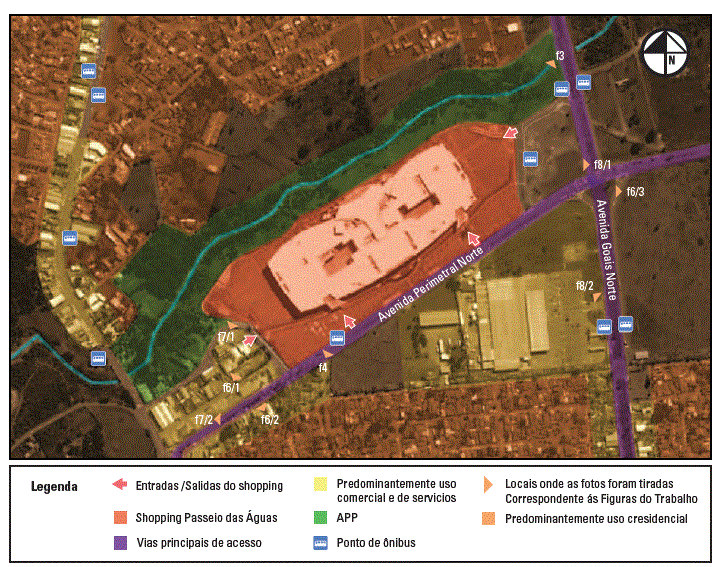 A partir do procedimento de análise construído pretende– se analisar a paisagem urbana do Shopping em estudo, em Goiânia (GO), Brasil. O empreendimento está localizado na região norte da cidade, na confluência das Avenidas Perimetral Norte e Goiás Norte, como mostra a figura 2. E tem funcionamento de segunda a domingo, sendo as lojas das 10 h às 22 h e alimentação das 10 h às 22 h 30, de segunda a sábado, e nos domingos, as lojas funcionam das 14 h às 20 h, alimentação e Lazer das 11 h às 21 h (Sonae Sierra Brasil 2013).