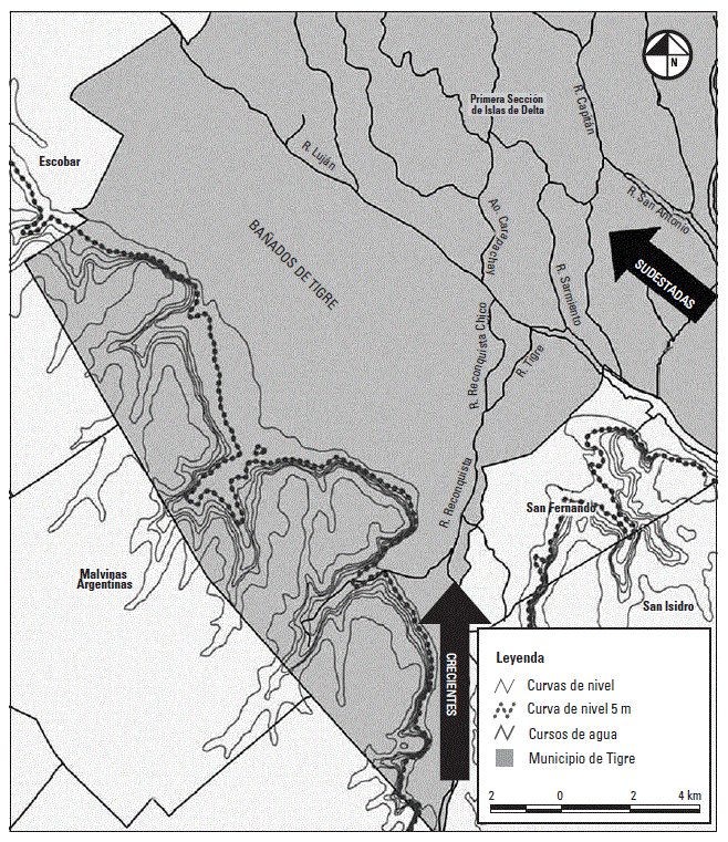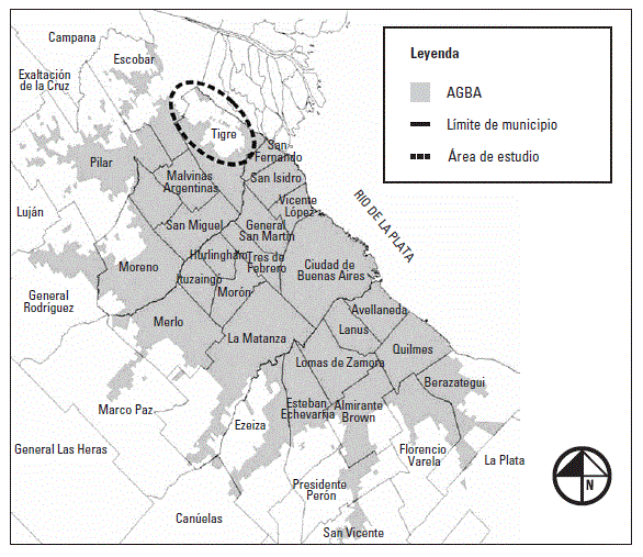 Al igual que en otros lugares del mundo, el crecimiento de uc ubicadas en los alrededores del Aglomerado Gran Buenos Aires —en adelante, AGBA— durante las últimas décadas ha implicado la incorporación urbana de áreas bajas sobre distintos frentes de agua: a) los valles de inundaciones de ríos y arroyos que lo atraviesan, b) el borde costero del Río de la Plata, c) las islas del delta del río Paraná y d) los bordes de algunas lagunas pampeanas cercanas. En referencia a los procesos antes mencionados, la urbanización reciente de áreas inundables pertenecientes a las bajas cuencas de los ríos Luján y Reconquista (conocidas localmente como “bañados”3) comprendidas en el sector continental del municipio de Tigre (figuras 1 y 2), constituye uno de los casos más representativos sobre esta temática. En el municipio de Tigre la superficie ocupada por este tipo de UC supera las 4.000 hectáreas; y si se consideran los municipios cercanos que también forman parte de la baja cuenca del río Luján, la cifra ya sobrepasa las 7.000 hectáreas, tal como sostienen Pintos y Narodowski (2012).