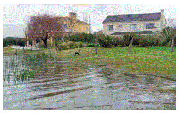 Sin embargo, también existen algunos cuerpos de agua de la zUC de Tigre de condición “mediterránea”, es decir, que no posee conexión con cursos de agua cercanos. Cuando se producen precipitaciones intensas, las aguas de los lagos cerrados aumentan e invaden los jardines linderos (figura 7), sin que hasta el momento hayan sido afectadas las viviendas, posibilidad que podría llegar a darse ante lluvias aún más extremas. La invasión de las aguas termina estropeando muelles, tablestacados, elementos de jardinería y plantas ornamentales, entre otros, por lo que han sido reparados en reiteradas ocasiones, tal como los sucesos que acontecieron con los lagos cerrados de los barrios Santa Clara y Santa Catalina en la mega UC Villa Nueva. En algunas oportunidades se han empleado como estrategia de mitigación bombas de achique, pero muchas veces no fueron suficientes o han dejado de funcionar en medio de tormentas intensas. Esto ha derivado en reclamos de los propietarios y de los desarrolladores para que el Estado se haga cargo de esa situación, siendo un conflicto que por el momento no ha encontrado solución. El otro extremo del problema es cuando se producen precipitaciones escasas. En 2005, por ejemplo, el nivel del pelo de agua de los lagos descendió más de 1,5 m respecto del nivel promedio motivado por las escasas lluvias de ese año, lo que generó que los jardines de los lotes frente a los lagos —los más costosos— tuvieran barros nauseabundos por un largo periodo de tiempo, lo cual perjudicó el uso y el valor estético buscado por los habitantes/propietarios19.