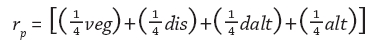 veg; dis; dalt; alt : criterios estandarizados (con un rango común de valores entre 0-1) de valor discreto para las variables.