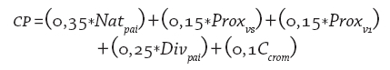 De acuerdo a Estévez, Garmendia y García (2012), el cálculo se realizó mediante un análisis directo e indirecto del paisaje, por medio del trabajo de campo y el análisis SIG de las UP. Para el cómputo, “se considera más importante la naturalidad y la diversidad paisajística (0,35 y 0,25) frente al resto de criterios” (Estévez, Garmendia y García 2012, 27) (ecuación 4).
