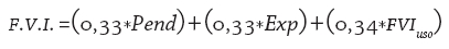 [Ecuación 4. Calidad del paisaje]Se consideran dos tipos de fragilidad visual, la intrínseca -en adelante, FVI- que corresponde a la exposición propia de la unidad, y la adquirida -en adelante, FVA- que corresponde al incremento de fragilidad en función de los observadores. En el caso de la FVI el cálculo se realiza mediante la suma ponderada con pesos iguales para los factores que generan la visibilidad (ecuación 5).