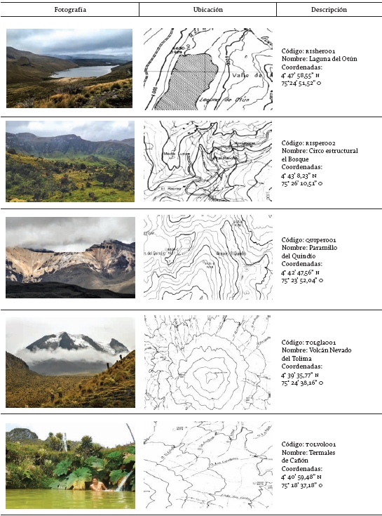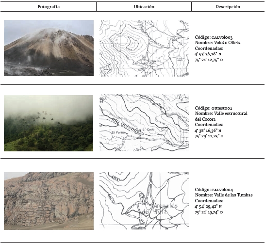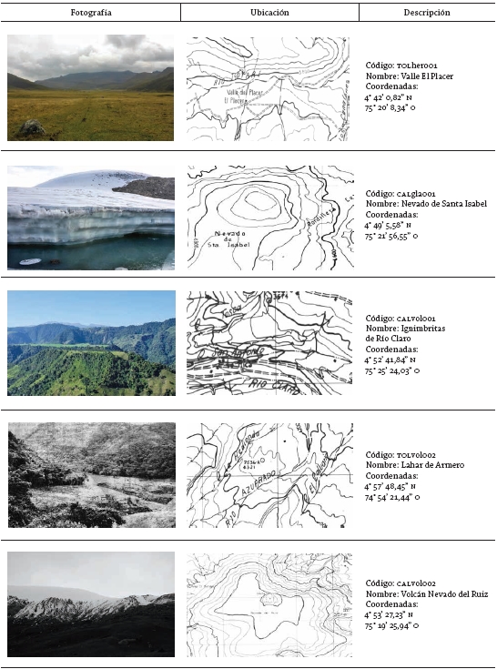 Datos: adaptado de Thouret 1989.En el CVGRT se encuentran numerosos lugares o sitios que ejemplifican la génesis del relieve superficial mediante la existencia de geoformas típicas de la Cordillera Andina de Colombia (figura 2). En este trabajo, se les asignará a esos lugares el nombre de geomorfositios, de acuerdo con la definición de Grandgirard (1997) que es retomada por Reynard (2004): todas las porciones de la superficie terrestre que posean una importancia particular en la comprensión de la historia de la tierra, de su clima y de la forma como las distintas especies han habitado en él. La definición hace hincapié en que el geomorfositio es un objeto íntegro de estudio, no solo en un contexto paisajístico, meramente científico o estático; se trata de una entidad funcional relacionada con el ser humano y las demás especies, y cuenta con un dinamismo natural (Fissherser y Lambert 1977). Siguiendo esta definición, Panizza (2001) agrega que los geomorfositios tienen diversas escalas que pueden variar desde una forma puntual -suelo con cenizas volcánicas-, a relieves extensos -valles con hombreras glaciares- a los cuales el hombre les confiere valores específicos por razones científicas, ecológicas, estéticas, culturales o económicas (turísticas).