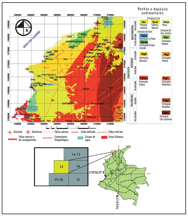 A área de estudo está compreendida pela porção emersa da carta topográfica Cartagena 1:100.000, produzida pelo Instituto Geográfico Augustín Codazzi (IGAC), a qual possui, também, sua correspondente geológica elaborada pelo Instituto Colombiano de Geología y Minería (Ingeominas) (figura 1).