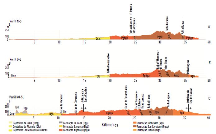 Analisado o perfi l N-S, observa-se o relevo de Terraços e Planícies Coluvioaluviais amplamente distribuído até seu contato com a Formação Arjona. Nesse trecho, predomina um relevo aplainado. Já na Formação Arjona, é possível observar as vertentes convexas com baixas declividades. Em sentido sul, a Formação Arjona faz contato com a Formação San Cayetano através da falha de cavalgamento Villanueva-El Totumo, entretanto, devido à disposição desse perfil, as vertentes, no início da Formação San Cayetano, não são visualizadas em seu melhor ângulo, visto que a compressão tectônica que gerou a Serrania de San Jacinto tem sentido NE. Quando o relevo representado nesse perfil alcança sua maior altitude e declividade, as vertentes são bem-visualizadas, sendo observadas vertentes com declividades acentuadas e de formas convexas a retilíneas, além de degraus entre as falhas de Luruaco e Blanco, o que é indicativo de uma sequência de falhas inversas (figura 10).