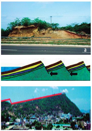 Analisando o perfil NW-SE, que se inicia numa planície costeira, observam-se, nitidamente, dois morros testemunhos completamente anômalos em sua morfologia, altitude e declividades, que são constituídos pela Formação La Popa (figura 10). Essa morfologia impede qualquer compreensão de sua gênese que não seja baseada numa tectônica recente. São visualizadas vertentes retilíneas a barlavento muito mais íngremes que as localizadas a sotavento.
