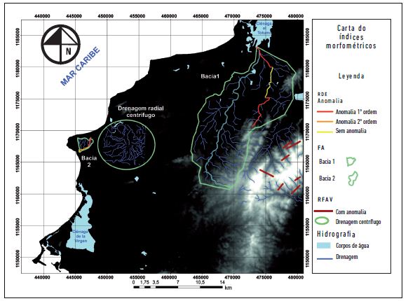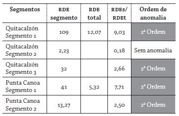 No riacho Punta Canoa, nos dois segmentos analisados, foram encontradas anomalias de segunda ordem. No segmento 1, que percorre a Formação Bayunca, o valor obtido foi superior ao encontrado no segmento 2, que recorre os depósitos de planície costeira (tabela 1). Os valores obtidos com a aplicação do índice RDE confirmam uma tectônica ativa não somente no Cinturão de Sinú, como também nos depósitos quaternários inconsolidados, o que reforça a constatação de que a atuação tectônica está presente na atualidade e evidencia-se como componente ativo na configuração das formas do relevo e da rede hidrográfica.
