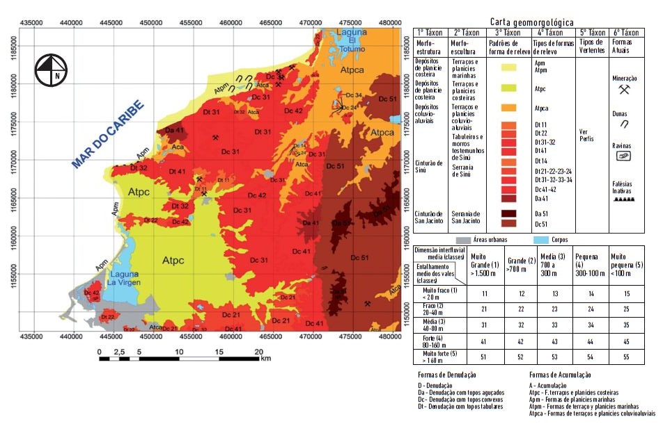 Baseado na construção e análise da carta geomorfológica produzida (figura 9), foram individualizadas cinco morfoestruturas para a área: Cinturão de San Jacinto, Cinturão de Sinú, depósitos de planície costeira, depósitos coluvioaluviais e depósitos de praia. As morfoestruturas foram subdivididas em seis morfoesculturas assim denominadas: Serrania de San Jacinto, Serrania de Sinú, Baixos Tabuleiros e Morros Testemunhos de Sinú, Terraços e Planícies Costeira, Terraços Coluvioaluviais e Terraços e Planícies Marinhas.