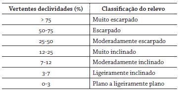 Por meio da geração da matriz irregular e regular a partir das curvas de nível, gerou-se a carta clinográfica. Para sua elaboração, foi selecionada a extensão spatial analyst tools no aplicativo Surface, ferramenta slope. Para este trabalho, optou-se pelos intervalos de declividade de vertentes proposta por IGAC ([1968] 1980) (tabela 1).