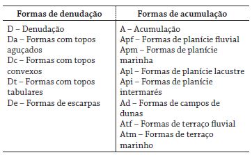 As formas relacionadas ao 3° Táxon são representadas no mapa geomorfológico por meio de um conjunto de letras maiúsculas e minúsculas. As letras maiúsculas indicam os padrões que se formaram por denudação (letra D) ou por acumulação (letra A) e as letras minúsculas representam as formas geradas (tabela 2).