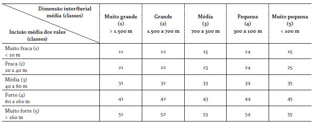 Os padrões de forma de relevo estão acompanhados de um conjunto de algarismos arábicos de acordo com uma matriz previamente elaborada, cujas colunas indicam o grau de incisão dos vales; as linhas, a dimensão interfluvial média (tabela 3). As formas agradacionais não recebem os algarismos arábicos, pois não representam dissecação por processos erosivos.