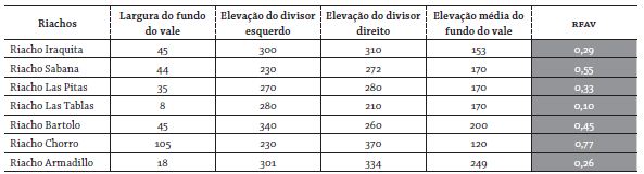 Todos os riachos analisados apresentaram valores de RFAV inferiores a 1 e estão encaixados em vales em formas de v. Os resultados apresentados nesses riachos são similares aos valores obtidos por El Hamdouni et al. (2008) na região da Sierra Nevada, ao sul da Espanha, numa região de limite convergente de placas litosféricas e tectonicamente ativas.