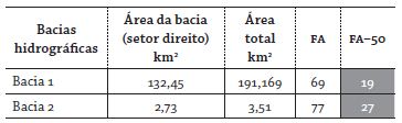Nessas duas bacias, os valores obtidos foram muito elevados e considerados de forte assimetria, com valores de 19 e 27 para as bacias 1 e 2, respectivamente (tabela 6). Esses valores, somados às formas retilíneas dos canais principais e às discrepâncias entre os afluentes de suas margens, reforçam a influência tectônica recente na configuração e disposição da rede de drenagem.
