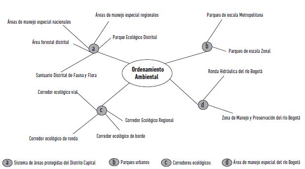 El plan de ordenamiento territorial —en adelante, POT— de Bogotá (Alcaldía Mayor de Bogotá 2004) establece como estrategia de ordenamiento distrital varios principios, dentro de los cuales se identifica la protección y tutela del ambiente y los recursos naturales, así como su valoración como sustrato básico del ordenamiento territorial. Para consolidar esta estrategia, surge la estructura ecológica principal —en adelante, EEP—, constituida por una red de corredores ambientales localizados en jurisdicción del Distrito Capital e integrados a la estructura ecológica regional, cuyos componentes básicos son el sistema de áreas protegidas, los parques urbanos, los corredores ecológicos y el área de manejo especial del río Bogotá.