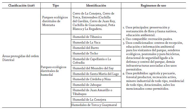 Dentro de la clasificación del SAP (figura 1), se encuentran dos componentes esenciales: por un lado, las áreas protegidas del orden nacional y regional y, por otro, las áreas protegidas del orden distrital. En estas se comprehenden los parques ecológicos distritales, que son áreas de alto valor escénico o biológico y que, por sus condiciones de localización y accesibilidad, se destinan a la preservación, restauración y aprovechamiento sostenible de sus elementos biofísicos para la educación ambiental y la recreación pasiva. Se distinguen dos tipos: los parques ecológicos distritales de montaña y los parques ecológicos distritales de humedal, que responden a regímenes de uso específicos (Art. 94, 95 y 96 del Decreto 190 de 2004) (tabla 1).