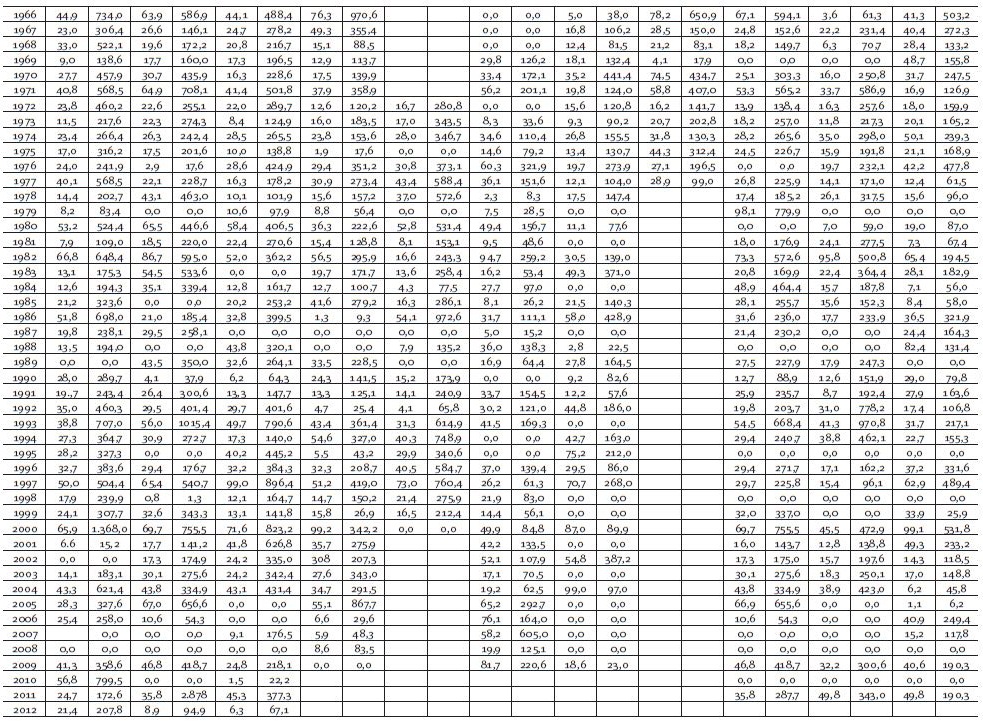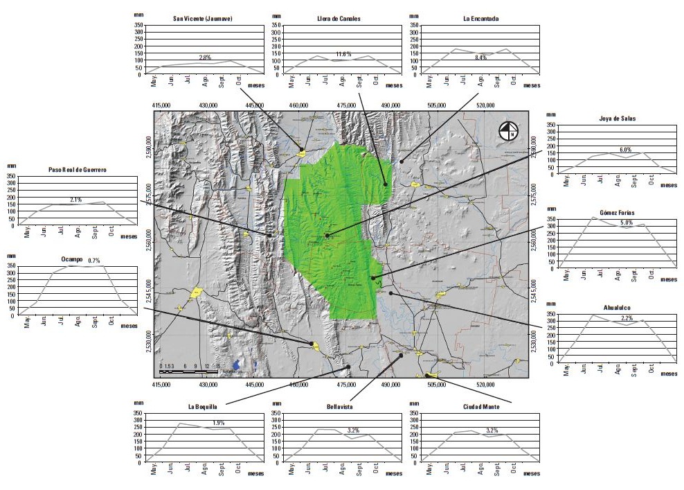 Datos: elaborado a partir de los registros mensuales pluviométricos continuos de CONAGUA 1922-2012; INEGI 2000.