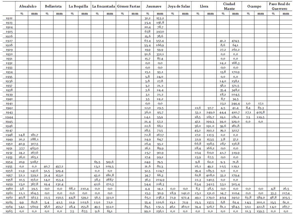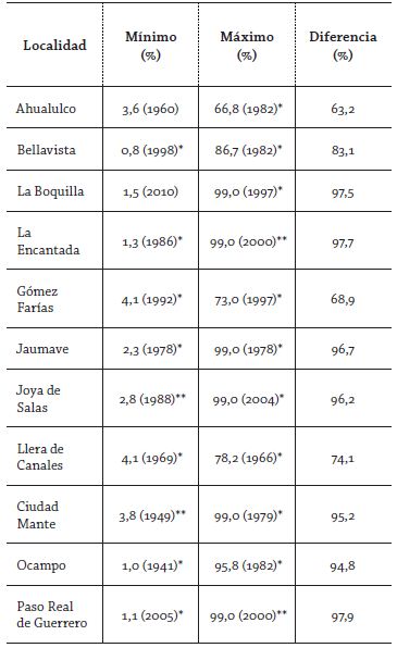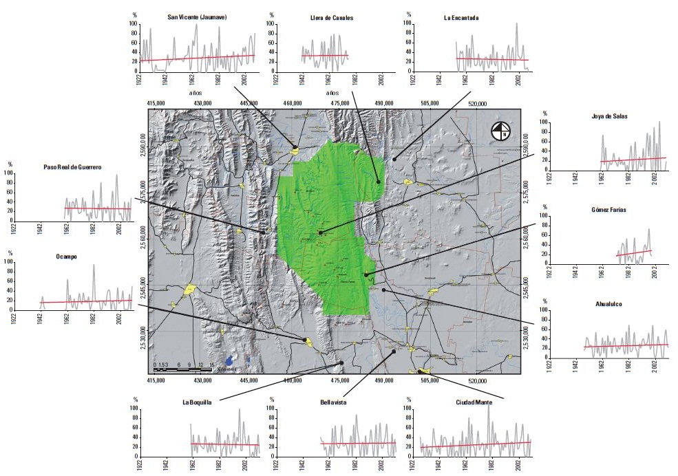 En algunos años, las once localidades parecen compartir una sincronía en el máximo canicular, durante 1964, 1971, 1977, 1982, 1984 y 2000, en este último año, la sequía fue severa en seis de las once localidades (Bellavista, La Boquilla, La Encantada, Joya de Salas, Cd. Mante y Paso Real de Guerrero). Por su parte, en 1966-1967, 1983-1984, 1993-1994, 2004-2005 y 2009-2010 ocurrió un desfase de un año entre las once localidades.