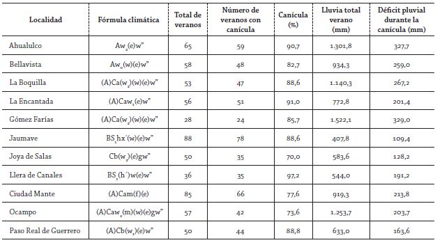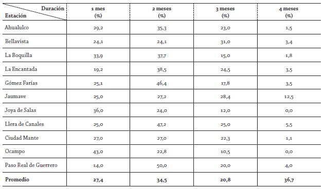 En promedio, en el periodo 1922-2012 la canícula abarcó los meses de julio y agosto en seis de las once localidades (Bellavista, La Boquilla, La Encantada, Gómez Farías, Llera de Canales y Paso Real de Guerrero), mientras que en Ahualulco, Jaumave, Joya de Salas, Ciudad Mante y Ocampo ocurrió solo en julio y coincide con los resultados reportados por Peralta-Hernández et ál. (2008). Sin embargo, cuando se analiza la variabilidad interanual de la canícula, a través de las frecuencias acumuladas en cada una de las once localidades, en el 27,4% de los veranos la duración fue de un mes, en el 34,5% de dos, en el 20,8% de tres y en el 36,7% se prolongó cuatro meses (tabla 3).