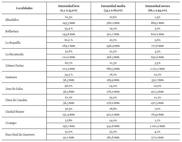 Todos los grupos climáticos de la zona de estudio presentaron canícula en el 84,5% de los veranos analizados, la mayor intensidad promedio se registró en Llera de Canales, seguida de San Vicente (Jaumave), localidad con clima seco (BS), ubicada en la porción de sotavento de la Sierra Madre. Este comportamiento se debe a los vientos descendentes secos. Los climas semicálidos (A)C se dan en Ahualulco, Bellavista, La Encantada, Gómez Farías, Ciudad Mante, La Boquilla, Ocampo y Paso Real de Guerrero. Por su parte, la menor intensidad del clima ocurre en la localidad Joya de Salas con clima templado (Cb) (figura 1 y tabla 2). La precipitación en la zona de estudio proviene, en gran medida, de los vientos alisios que tienen su origen en los mares tropicales del Atlántico septentrional e ingresan al Golfo de México bajo la influencia del gran anticiclón Bermuda-Azores; estos vientos describen una amplia curva alrededor de este centro de alta presión, hacia una faja térmica localizada en el sw de los Estados Unidos. La mitad caliente del año se caracteriza por el predominio del anticiclón oceánico o centro de acción del Atlántico norte. La invasión del aire tropical adopta la forma de una “lengua de humedad” que penetra el territorio mexicano, bajo la influencia de la corriente alisia que en esta época del año adquiere un espesor considerable (García y Sánchez-Santillán 1996). Las diferencias registradas en el volumen de la precipitación dentro de la cuenca de estudio se deben al efecto de sombra orográfica ocasionado por la Sierra de Nogales, en el caso de la localidad de Jaumave, y la Sierra de La Maroma, en la localidad de Llera. En la porción sotavento de dichas sierras, se registraron mayores volúmenes de lluvia derivados de la corriente alisia, cuyos vientos son cálidos y húmedos, los cuales se enfrían por ascenso orográfico y descargan su humedad. Al traspasar la sierra en la porción de barlovento, tienen trayectorias descendentes y, por lo tanto, son de carácter seco. Existe un incremento de humedad en la porción central y SW de la Sierra Cucharas por efecto de ascenso orográfico, lo que explica el aumento de humedad tanto en la RBC, como en las partes ascendentes de dicha sierra.