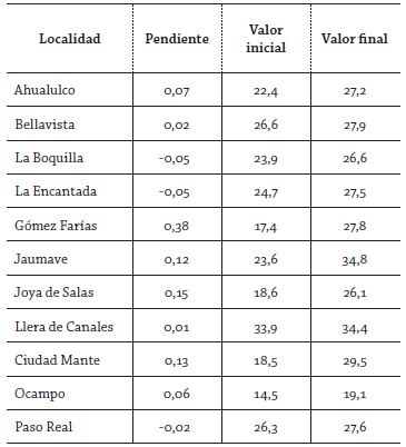 En el análisis de la tendencia, el sentido de la pendiente fue positivo en ocho localidades y negativo en tres (figura 2, tabla 7); sin embargo, el comportamiento gaussiano de la canícula ocasiona que el ruido de la señal provoque una varianza alta, por lo que la pendiente resulta prácticamente imperceptible y coincide con los resultados hallados por Geng et ál. (2011) durante el periodo 1961-2008 en China.