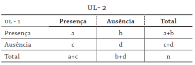 Neste estudo, foi utilizada a técnica de índice de associação do T-Lab. Essa ferramenta permite analisar coocorrências das unidades lexicais — doravante UL, no interior dos contextos elementares, ou seja, dados binários do tipo presença/ausência (Franco 2017). Aqui, usou-se o índice Coseno, que é representado pela seguinte equação: