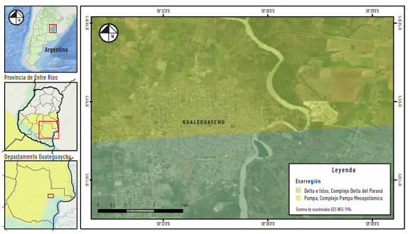 La ciudad de Gualeguaychú, provincia de Entre Ríos (Argentina), está en la costa del río homónimo, el cual se ubica en una zona geológica y ecosistémica caracterizada por la formación de humedales, entre la pampa mesopotámica y el delta (Matteucci 2012, 2013). En los últimos años, se ha prestado especial atención no solo a la presencia del humedal, sino a su constitución; considerando el concepto de ecosistema, en el que está presente la dependencia recíproca de sus propiedades estructurales y funcionales con el régimen hidrológico (Brinson 2004; Kandus et ál. 2011; Ten Brink et ál. 2013). El río Gualeguaychú forma parte de la cuenca del río de La Plata. Sus principales colectores son los ríos Paraná, Paraguay y Uruguay. En consonancia con lo expuesto, y de acuerdo con la clasificación de Morello et ál. (2012), el ambiente del río Gualeguaychú forma parte del que presenta el río Uruguay y se ubica en un impreciso límite entre la pampa mesopotámica y la ecorregión del Delta e Islas del río Paraná y Uruguay (complejos delta del Paraná y complejo Islas del río Uruguay). El área está atravesada por cursos de agua y las costas de los ríos funcionan como valles de inundación y humedales. Esta es la perspectiva central del análisis (figura 1).