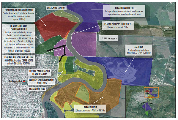 A pesar de esta normativa, la especialización planteada generó cambios espaciales importantes en el río: en ambas costas, sobre la vera del río, se ve la proliferación de cabañas y diversas concesiones (clubes, campings, bares, piscinas, etc.). Están los casos de la Guardería de Lanchas del Tiro Federal Gualeguaychú, el Club de Pescadores, el Balneario Norte y Náutico, que en su mayoría presenta elevaciones clandestinas, lo que evidencia una clara falencia del poder ejecutivo. De todos modos, hay dos casos de barrios cerrados en la costa que han sido suspendidos. Cuando nos alejamos algo de la ciudad, mantiene su importancia la producción agropecuaria de la costa. Por otro lado, se verifica la proliferación de barrios vulnerables sobre zonas inundables, y algunos han sido trasladados, con lo que se generan parquizamientos8, pero aún hay gente viviendo en las partes bajas de los barrios Munilla, Pueblo Nuevo, Ayacucho al sur y Médanos. La densidad es mínima, pero se observa una tendencia al aumento. El mismo caos puede verse cerca de otro futuro parquizamiento, en Plaza de Aguas, cerca del cual hay un basural a cielo abierto. La Municipalidad de Gualeguaychú propone ampliar los citados espacios, incluso parquizando las avenidas y habilitando las reservas mencionadas, junto con los arroyos, como potenciales corredores para parques públicos e interpretación de especies nativas.