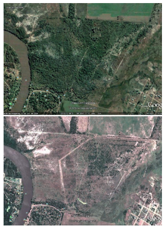 En las imagenes del lote en el que se planea el proyecto (figura 4, fotografía superior), de junio 2004, desde el punto de vista físico-biótico, puede verse un monte denso mixto de algarrobos, ñandubay, coronillos, talas, chañar y espinillos, en el que era posible encontrar la flora y la fauna descripta en párrafos anteriores. En la imagen de enero del 2012 (figura 4, fotografía inferior) puede verse el desmonte total del predio, aun cuando el emprendimiento no contaba con un dictamen de CORUFA ni con certificado de aptitud ambiental.