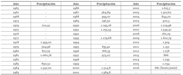 Las precipitaciones promedio en Gualeguaychú fueron entre 1978 y 1988 de 976,12 mm; de 1989 a 1998 fueron similares, pero de 1999 a 2015 se elevaron a 1.257,48 mm. Como muestra la tabla 1, la tendencia de lluvias acumuladas anuales del periodo 2006-2015 supera el promedio del registro del periodo anterior en 378 mm y en 271 mm el del periodo 1986-1995. Los registros tomados desde el 2005, comparados con la media de 61-90 mm arrojan que en el periodo 2005-2015 se superó la media anual, al menos en siete oportunidades. Sin embargo, año a año, el efecto no es semejante y la correlación no es lineal.