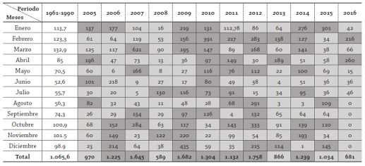 Si analizamos las lluvias mensuales, observamos un progresivo aumento de los meses que pasan la media por año (la establecida por el Servicio Meteorológico Nacional —en adelante, SMN— es de 1.065,6 mm). Comparado con las precipitaciones anuales desde el 2005 al 2015, como fue señalado, siete años fueron mayores a la media. Asimismo, se destaca el periodo 2009-2012, donde dicha superación se dio por cuatro años consecutivos, con un total entre 1.100 mm y 1.700 mm. Los meses más lluviosos del año, según el SMN, son desde octubre a marzo con un poco más de 100 mm. En la tabla 3 podemos ver que ese promedio claramente ha aumentado en 10 años, incluso en casos extraordinarios, en un mes llovió la mitad de lo que llueve en un año (ver marzo-2007, diciembre-2009). Otra particularidad es que en los meses invernales las precipitaciones se han duplicado e incluso ha alcanzado valores del verano o mayores (ver junio 2006, agosto 2012, mayo 2014). Inclusive en el 2015, cuando llovió poco cada mes, enero (con precipitaciones extraordinarias de 300 mm), agosto, octubre y diciembre, alcanzaron a llegar a la media anual. Los factores mencionados han contribuido a la progresión de eventos en los que aumenta la altura del río Gualeguaychú. En la tabla 3 se observa el fenómeno año a año y sus máximas.