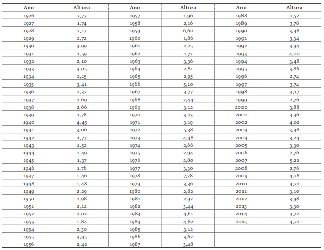 Lamentablemente no contamos con información diaria. La mayor crecida anual no es un indicador adecuado, por lo que esta falencia la hemos cubierto, al menos en parte, con informantes claves. Hasta los años sesenta se verificaba cero o un año de crecida por década en el puerto. Hasta los años noventa, se pasó de dos a tres. Y en la última década hubo seis años con seis crecidas por encima de 4 m, con algunas tormentas, como la de 1978, que superó los 7 m. Como se observa, la intensidad, frecuencia y forma van cambiando, hay pocas correlaciones precisas y los modelos no aclaran estas situaciones. La península empieza a inundarse, si el agua viene de arriba, en el puerto está a 2,8 m y los caminos que la comunican tienen una elevación de 3,80 m, los cuales no se elevan pero generan inundación en los bajos. Algo similar sucede en el Parque Unzué, donde además repercute la elevación realizada en su borde, que funciona como valla de contención para el río dentro de su valle. En el Camino de la Costa se empieza a inundar a 3,2 m y en la zona del arroyo Munilla a 3,5 m. Hay que tener en cuenta que cuando el agua alcanza 4 m, en el puerto se inician las evacuaciones, como en las de 2015, en que 6.000 personas llegaron a ser evacuadas. Con un nivel de 3,8 m en el puerto, los gestores turísticos se ven obligados a suspender las reservas. En los últimos dieciséis años hubo siete eventos que superaron la marca.